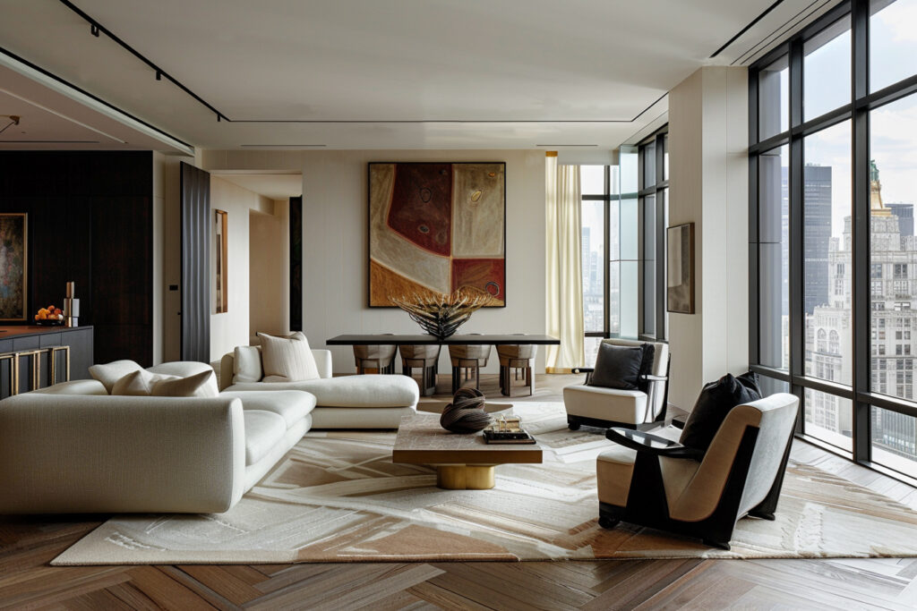 A sophisticated, minimalist penthouse with floor-to-ceiling windows offering sweeping views of New York City. Neutral tones, luxurious textures, and sleek finishes define this elegant space, designed for refined urban living with a focus on style and comfort.